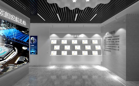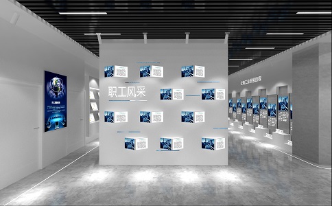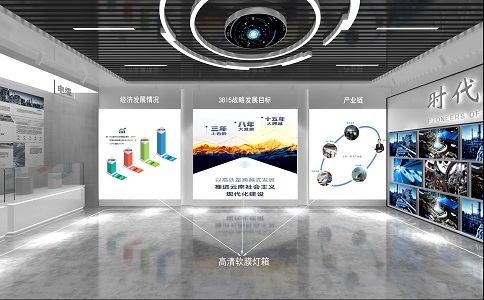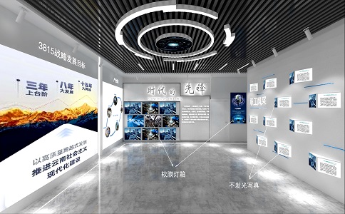 內(nèi)部頂造型:軟膜天空吊頂+LED線性燈帶凸顯展廳高端大氣、LED高清液晶屏,人臉識別系統(tǒng)、智能系統(tǒng)。